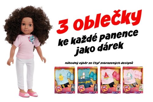 Sada Bábika Mia + 3 druhy oblečkov. Pozdravte sa s Miou, 46 cm vysokou bábikou, s nádhernými tmavo hnedými, kučeravými vlasmi, dlhými 33 cm. Mia miluje čas strávený so svojimi priateľmi. Rada počúva hudbu a píše svoje vlastné piesne. Miluje tanec a rada navštevuje koncerty a trampolínový park. Keď je pekné počasie, nájdete Miu vonku, ako jazdí v parku na bicykli. Mia je oblečená v mäkkom ružovom tričku s potlačou vtákov, v bielych legínach a ružovo-bielych balerínach. Bábiku možno ľahko prezliekať. Dlhé, realistické vlasy je možné upravovať do vrkočov. Inšpiráciu a návody na účesy nájdete v priloženej brožúre. Mia je v sade s 3 druhmi oblečkov. Každý druh oblečku sa skladá z 2 ks oblečenia a 1 páru topánok. Náhodný výber 3 druhov oblečkov. Oblečky v jednotlivých sadách sa môžu líšiť. Rozmer balenia: 50 x 23 x 11 cm. Vek: 3+