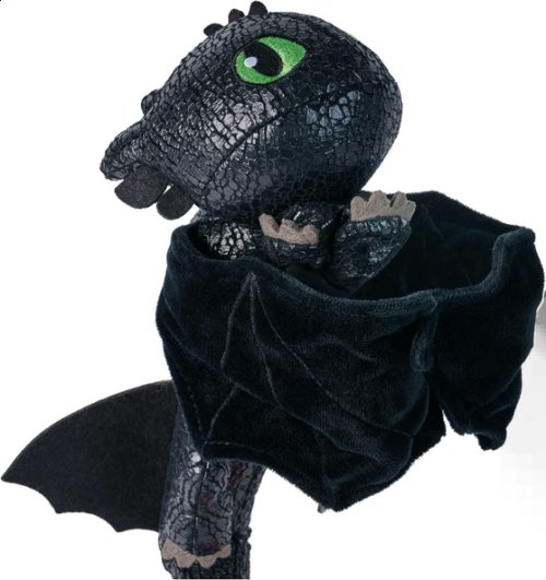 Plyšák Bezzubky o veľkosti 30 cm. Krídla obsahujú pásku, ktorú je možné draka prichytiť napr. na ruku. Ďalej potom pomocou gumových úchytov je možné draka vystreliť do priestoru ako výstrelom z praku.
