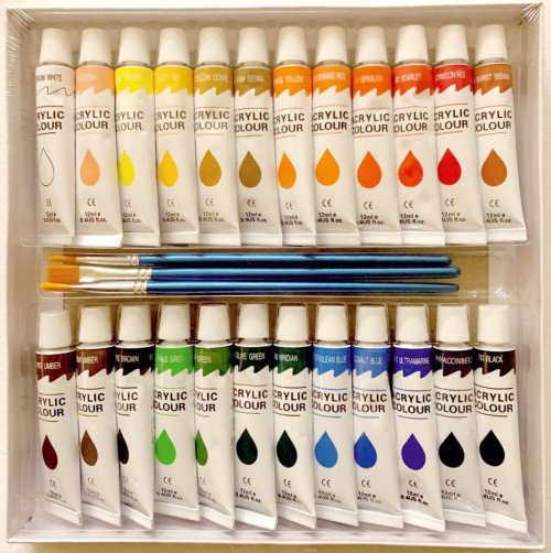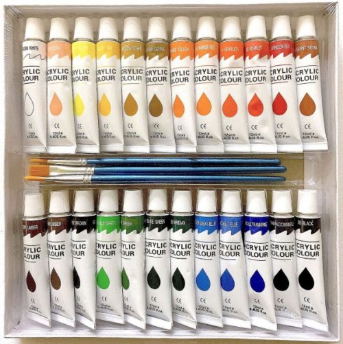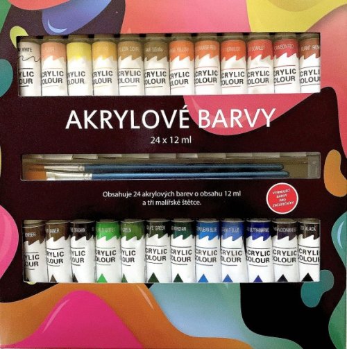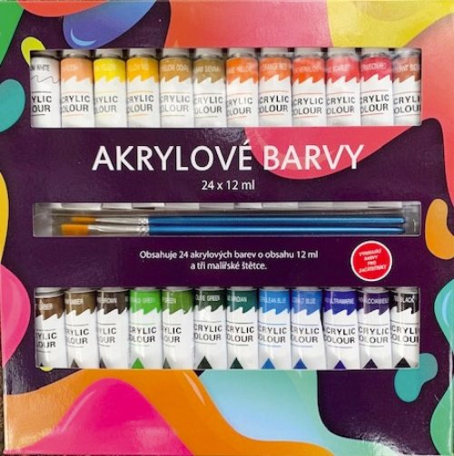 Farby sú vhodné na drevo, keramiku, sklo, papier, plasty ... balenie obsahuje 24 akrylových farieb v tubách po 12 ml a 3 štetce Rozmer krabičky: 22 x 22 x 2 cm Nie je hračka