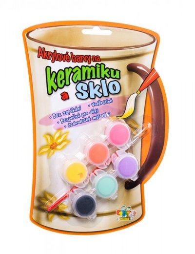 Bez zapekania, vodeodolné. Obsahuje 6 farieb á 3 ml v kalíškach, štetec. Bezpečné pre deti. Jednoduché maľovanie. Vodou riediteľné a možnosť vzájomne farby miešať na docielenie širšej farebnej palety. Rozmery balenia 14 x 21 x 2 cm. Vhodné pre deti od 3 rokov.