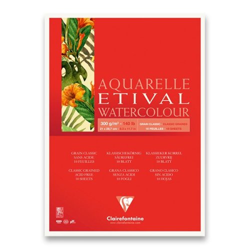 Akvarelový blok Clairefontaine Etival Classic Grain 300 g má 100% prírodný biely celulózový papier, ktorý je vhodný pre začiatočníkov a príležitostných užívateľov.