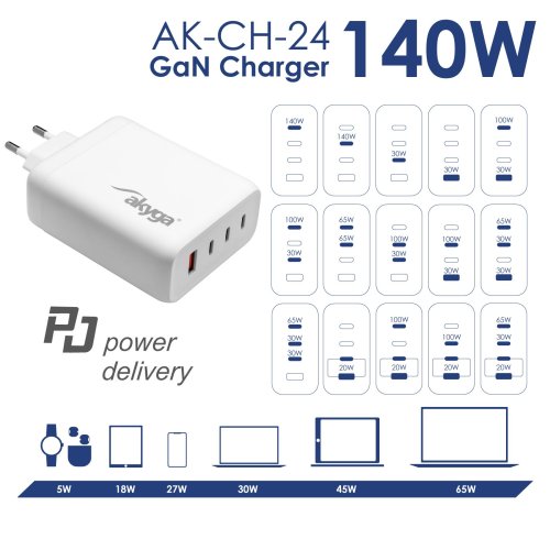 Nabíjačka Akyga® AK-CH-24 USB-C je pokročilé zariadenie, ktoré ponúka maximálny výkon 140 W a poskytuje rýchle a efektívne nabíjanie aj pre tie najnáročnejšie zariadenia.