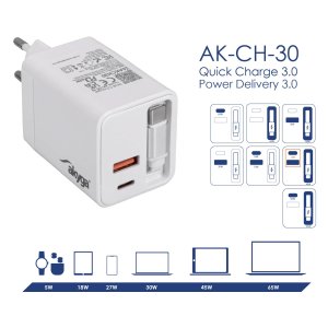 Akyga® AK-CH-30 je univerzálna USB nabíjačka s výkonom až 65 W , určená pre moderných užívateľov, ktorí potrebujú spoľahlivý zdroj energie pre viac zariadení súčasne. Nabíjačka ponúka 2× USB-C a 1× USB-A port, vrátane integrovaného 60cm kábla USB-C, čo umožňuje nabíjať až tri zariadenia naraz.