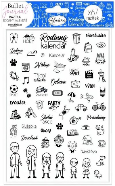 Súprava originálnych pečiatok na výrobu rodinného kalendára alebo na dotvorenie vlastného diára. Celoročné témy aktivít celej rodiny s českými textami sa dajú využiť aj na zábavné plánovanie s malými deťmi, budujú slovnú zásobu na tému rodina. Možno ich využiť aj na celý rad spoločných tvorivých aktivít. Sada obsahuje 67 ks pečiatok. Rozmer hárku je 13,2 x 19,2 cm.