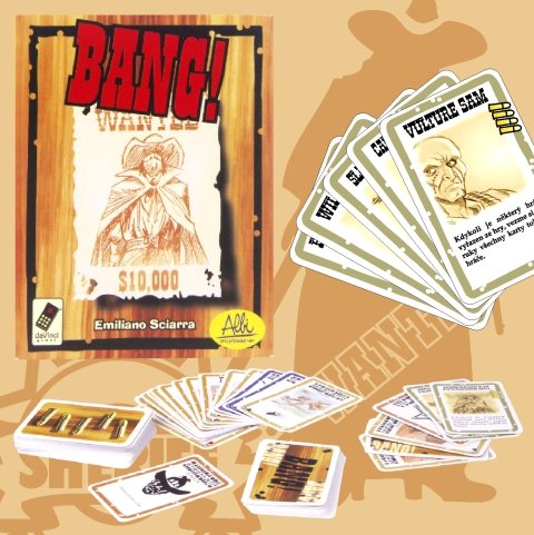 Bang, bang, bang! Banditi naháňa šerifa. Šerif páli po banditoch. Odpadlík kuje pikle chvíľu tam a zase tu. Guľky sviští okolo uší. A kto z hráčov je pomocník šerifa, pripravený za neho položiť život? A kto je bezcitný bandita, ktorý si praje šerifov koniec? Ak to chcete zistiť, taste svoje zbrane (teda karty)! V hre Bang! je dôležité sledovať ostatných hráčov, aby ste včas odhalili hráčovu identitu.