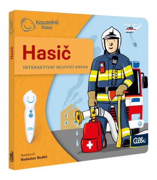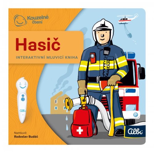 UPOZORNĚNÍ: Kniha Hasič funguje pouze s elektronickou tužkou ALBI (není součástí balení). Interaktivní mluvící mini kniha Hasič seznámí děti s tímto zajímavým povoláním. S elektronickou Albi tužkou se seznámí s hasičskými vozy. Uvidí, jakou používají techniku a dozví se, jak se staví protipovodňová hráz. V knize nechybí zábavný kvíz, který procvičí získané znalosti. Kniha obsahuje přes 500 zvuků a textů. Knihu Kouzelné čtení Hasič namluvil Radoslav Budáč a ilustroval Jan Lastovička. Doporučeno pro děti ve věku od 5 let. NECHTE KNIHY MLUVIT! Kouzelné čtení je unikátní výukový systém, který vám přináší spoustu informací a zábavy. Stačí, když se lehce dotknete elektronickou tužkou obrázku nebo textu, ozve se příslušná informace, zvuk nebo hudba. Kouzelné čtení je určeno dětem v předškolním věku, tak dětem starším, ale bezpochyby zaujme i dospělé. Díky speciální technologii mohou knihy plně využívat i děti v předškolním věku, které ještě číst neumí. Samy si tak mohou „přečíst“ pohádku nebo se hravou formou naučit poznávat barvy, čísla, písmena či nejrůznější tvary. Výhody Kouzelného čtení ALBI: