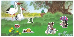 Lesklá obálka, 9 lesklých vnútorných strán a 2 strany lesklých opakovateľne snímateľných samolepiek, v tomto produkte si deti pomocou samolepiek zostavujú obrázky, tým rozvíja priestorové vnímanie a svoju fantáziu, taktiež pomocou samolepiek dopĺňajú hlavolamy a kvízy.