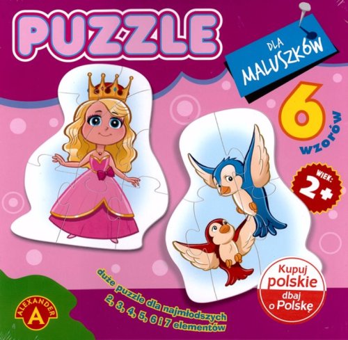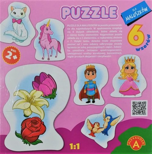 šesť progresívnych puzzle od 2 do 7 dielikov veľké a silné dieliky pre ľahšie držanie rozvíjajú detskú pozornosť, podporujú psychomotorický vývoj, predstavivosť a podnecujú zvedavosť obrázky s obľúbenými detskými motívmi