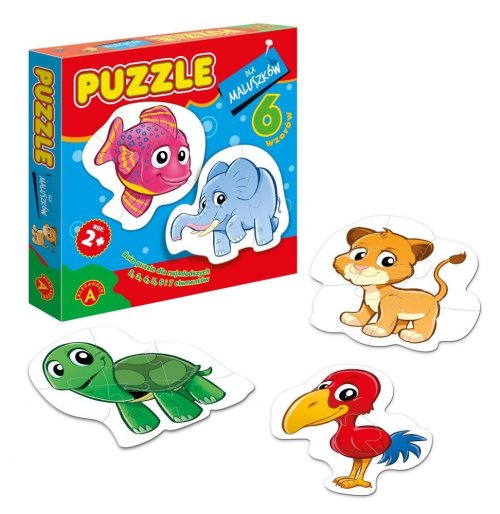 šesť progresívnych puzzle od 2 do 7 dielikov veľké a silné dieliky pre ľahšie držanie rozvíjajú detskú pozornosť, podporujú psychomotorický vývoj, predstavivosť a podnecujú zvedavosť obrázky s obľúbenými detskými motívmi