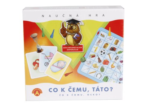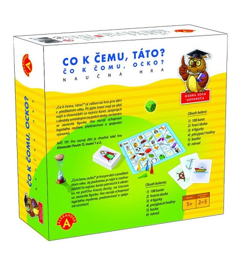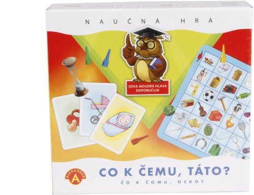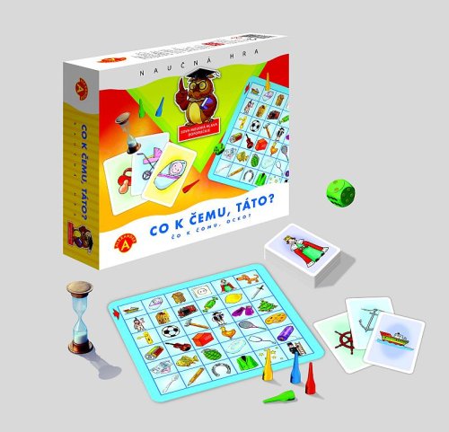 A próóč, ocko? Hra, ktorá pomôže deťom objasniť súvislosti a uspokojiť ich zvedavosť, ktorá je pre nich taká typická. 3 úrovne hry pre rôzny vek. Pre 2-4 hráčov od 4 rokov. Rozvoj logického myslenia a spájania významov a poznávania, sú najväčšie benefity tejto hry pre deti od 4 rokov. Úlohou je hľadať niekoľko súvislostí medzi obrázkami na poliach hracích dosky a obrázkami nájdených kartách a správne ich pospájať. Obtiažnosť hry je možné voliť podľa veku a skúseností detí. Hra obsahuje: karty s obrázkami 108 kshracia doska 1 ksfarebné figúrky 4 kspresýpacie hodiny 1 kshrací kocka 1 ksčeský s slovenský návod k hre Hlavné vlastnosti: rozvoj logického myslenia spájanie významov a poznávaniehra pre 2-4 hráčov Dokumentácia: návod k hre SKnávod