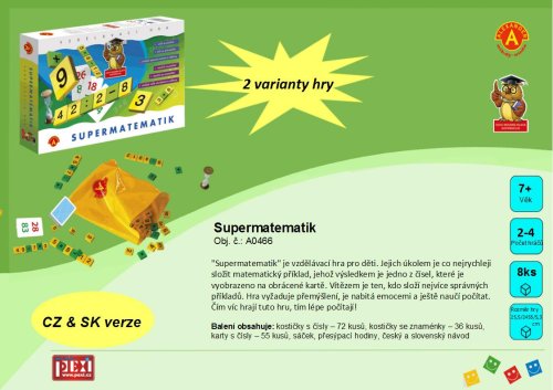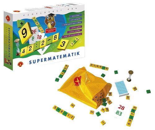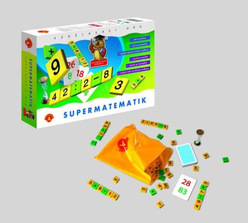 Urobte zo seba Supermatematika. Čím viackrát si zahráš, tým budeš v počítaní lepší! Pre všetky deti, ktoré sa nechcú nudne sedieť nad papierom s ceruzkou pri učení a opakovaní počítania. Skladaj sa súperovi početný príklad, aby si došiel k výsledku ktorý je na vyžrebovanej karte. Z vrecka si postupne vyžrebuješ čísla a matematické znamienka. Tvojou úlohou je čo najrýchlejšie zložiť matematický príklad, ktorého výsledkom je jedno z čísel, ktoré je zobrazené na obrátenej karte. Víťazom je ten, kto zloží najviac správnych príkladov. Hra je nabitá emóciami, vyžaduje trochu premýšľania a ešte ťa zdokonalí v počítaní. - učíš sa počítať - učíš sa premýšľať - zažiješ veľa emócií a zábavy. Balenie obsahuje: kocky s číslami – 72 kusov kocky so znamienkami – 36 kusov karty s číslami – 55 kusov presýpacie hodiny sáčok český a slovenský návod Hlavné vlastnosti: český a slovenský návod hra zdokonalí deti v počítaní učí sa premýšľať zažívajú veľa zábavy