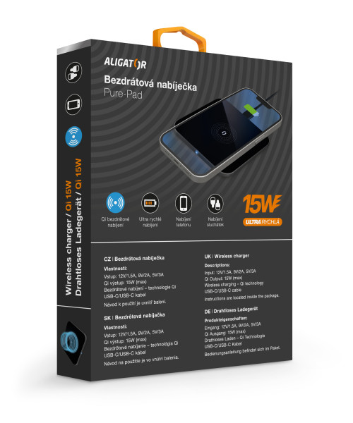 Rýchle nabíjanie bez kábla Výkonný a praktický Aligator Pure-Pad si hravo poradí s rýchlym bezdrôtovým nabíjaním vďaka cievke s výkonom 15W, ktorá dokáže doplniť energiu v čo najkratšom čase. Užívajte si rýchle nabíjanie pohodlne a bez kábla!