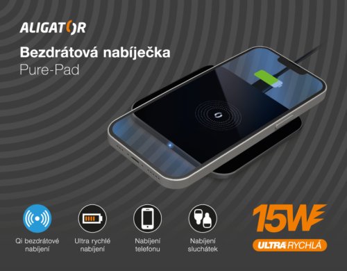 Bezdrôtová nabíjačka Aligator Pure-Pad Prémiová nabíjačka s podporou rýchleho bezdrôtového nabíjania s výkonom 15W. Hravo a bezdrôtovo nabije Váš mobilný telefón alebo TWS slúchadlá.