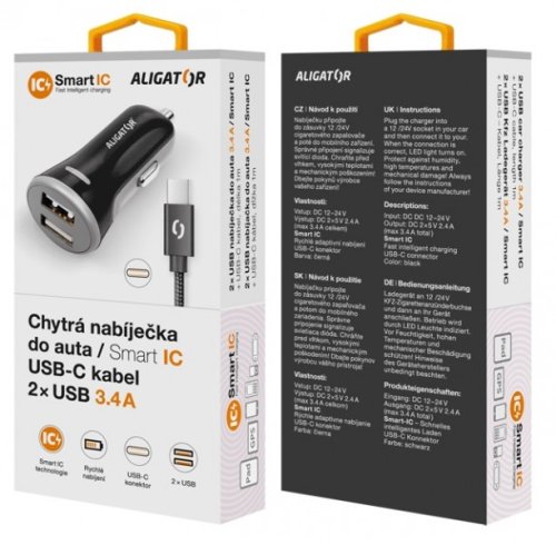 Múdra nabíjačka do auta ALIGATOR 3.4A, 2xUSB, smart IC, čierna, USB-C kábel Nová výkonná nabíjačka do auta radu „SMART IC“ v čiernom prevedení, dvoma USB portami s výstupnou kapacitou 3.4A. Táto nabíjačka je ideálna pomocníkom na dobíjanie mobilného telefónu a iných zariadení prostredníctvom cigaretového zapaľovača. Múdra nabíjačka zvládne doplniť energiu až dvom prístrojom naraz, navyše je vybavená šikovným čipom pre rýchle nabíjanie. Až 5x rýchlejšie nabíjanie oproti bežnej USB nabíjačke. Funkcia Smart IC automaticky detekuje typ pripojeného zariadenia a prispôsobí nabíjací prúd a napätie tak, aby sa nabilo čo najrýchlejšie. Kompatibilné s väčšinou zariadení s USB portom. Súčasťou balenia je micro USB-C kábel 2A. Technické údaje: • Vstup: DC 12-24V • Výstup: DC 2x5V 2.4A (max 3.4A celkom) • SMART IC – rýchle adaptívne nabíjanie • Ochrana proti skratu a preťaženiu • USB-C kábel 2A • Farba: čierna