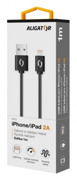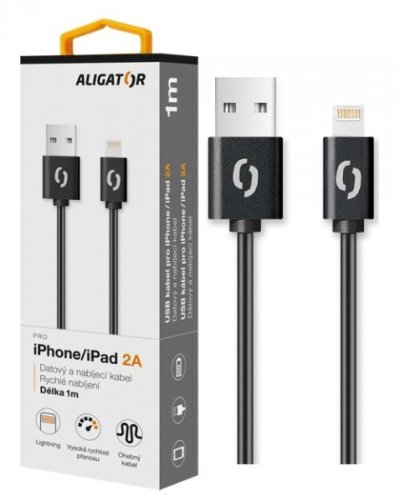 Dátový a nabíjací pre iPhone/iPad s lightning konektorom ALIGATOR: *Vysoko kvalitné konektory *Vysoká rýchlosť prenosu dát *Možnosť rýchleho nabíjania 2A *Dĺžka: 1m *Farba: čierna