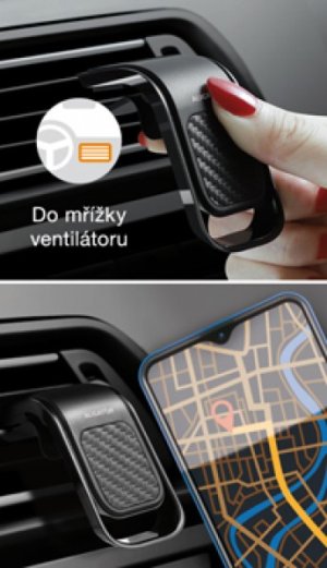 Kovový magnetický držiak pre mobilné telefóny do auta v dizajnovom karbónovom prevedení. Vďaka integrovanému silnému magnetu je možné zafixovať telefón prakticky akýchkoľvek rozmerov. Pomocou šetrného, ale pritom spoľahlivého mechanizmu, je možné ľahko pripevniť k ventilačnej mriežke bez rizika jej poškodenia.