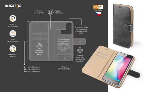 *Univerzálne puzdro *Zatváranie pomocou magnetickej pracky *Priehradka na kartu alebo vizitky *Vrecka na bankovky *Tenké prevedenie *Kvalitné spracovanie *Elegantný dizajn *Jednoduché uchytenie mobilného telefónu pomocou prémiovej nano podložky *Nano podložka slúži na opakované umiestnenie mobilného telefónu