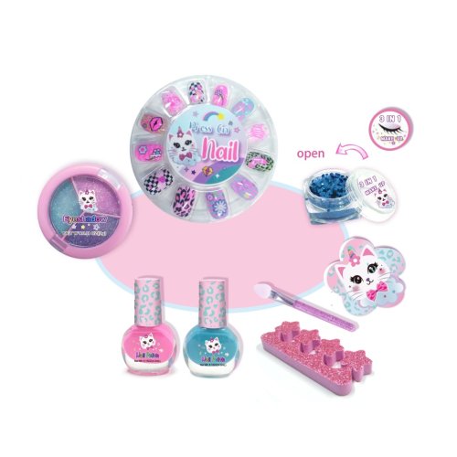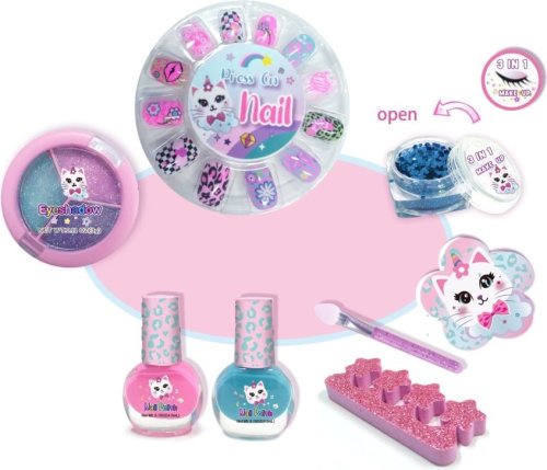 V balení nájdete trblietky na telo a tvár, nalepovacie farebné nechty, očné tiene, pilníček na nechty, 2 laky na nechty, oddeľovač prstov na lakovanie nechtov.