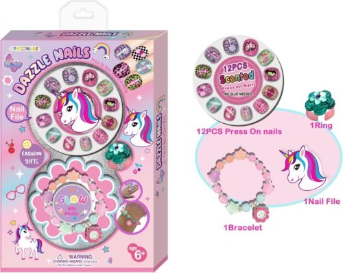 Balenie obsahuje: 12 nalepovacích nechtov, pilníček, prstienok a náramok.