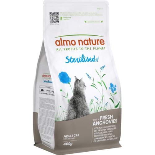 Almo Nature Sterilised je kompletné krmivo určené pre kastrované a menej aktívne dospelé mačky. Nízky obsah tuku a horčíka spolu s dostatočným množstvom vlákniny robí z tejto receptúry vhodnú voľbu pre sterilizované mačky a mačky so sklonom k nadváhe. Ideálna je v kombinácii s kapsičkami Sterilised. Ako hlavnú zložku obsahuje 26% čerstvých rýb (ančovičiek), ktoré zaisťujú vysokú chutnosť krmiva. Ďalej je krmivo obohatené o omega-3 a omega-6 mastné kyseliny, minerály, vitamíny, taurín, L-karnitín a prebiotiká na podporu črevnej mikroflóry. Granule sú konzervované prírodne, neobsahujú GMO, dochucovadlá, farbivá ani soli. Zloženie: čerstvé ančovičky* 26 %, kukurica**, ryža, sušené kura 13,1 %, kukuričné proteíny**, zemiakový proteín, kurací tuk, hydrolyzované živočíšne proteíny, ryžový proteín, minerály, inulín z čakan 1%, mannanoligosacharidy 0,1%, glukosamín 0,02%, chondroitín sulfát 0,01%, yuka schidigera 0,01%.