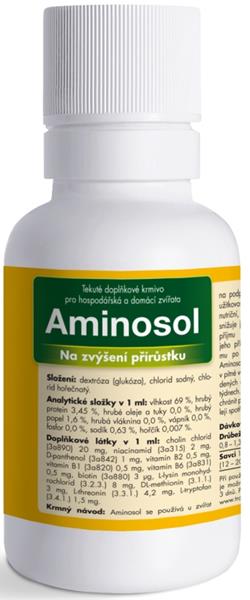 Problém: V niektorých prípadoch dochádza k zníženiu príjmu krmiva, napr. pri strese, zmene krmiva, pri a po priebehu ochorenia. Tieto stavy majú za dôsledok spomalenie rastu, zníženie úžitkovosti a tým zhoršenie ekonomických ukazovateľov. Zloženie v 1 ml: sodík 6,3 mg, horčík 0,07 mg, cholínchlorid 20 mg, niacínamid 2 mg, D - pantenol 1 mg, vitamín B2 0,5 mg, vitamín B1 0,5 mg, vitamín B6 0,5 mg, biotín 3 μg, L - lyzín HCl 8 mg, DL - metionín 3 mg, L - treonín 4,2 mg, L - tryptofán 1,5 mg. Spôsob aplikácie: Aminosol sa podáva zvieratám riadne rozriedený v pitnej vode alebo mlieku po dobu 5 – 15 dní v uvedených dávkach. Aplikáciu je možné opakovať po 3 – 4 týždňoch. Pri použití po zvýšenej námahe alebo ochorení je možné dávkovanie zdvojnásobiť po dobu cca 3 dní. Roztok je nutné pripravovať denne čerstvý, chrániť pred priamym slnečným svetlom a čo najrýchlejšie spotrebovať. Nepodávať neriedený prípravok! Dávkovanie: