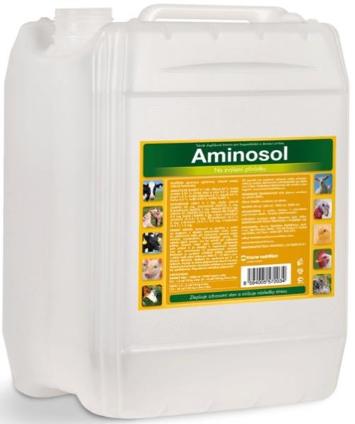 Problém: V niektorých prípadoch dochádza k zníženiu príjmu krmiva, napr. pri strese, zmene krmiva, pri a po priebehu ochorenia. Tieto stavy majú za dôsledok spomalenie rastu, zníženie úžitkovosti a tým zhoršenie ekonomických ukazovateľov. Zloženie v 1 ml: sodík 6,3 mg, horčík 0,07 mg, cholínchlorid 20 mg, niacínamid 2 mg, D - pantenol 1 mg, vitamín B2 0,5 mg, vitamín B1 0,5 mg, vitamín B6 0,5 mg, biotín 3 μg, L - lyzín HCl 8 mg, DL - metionín 3 mg, L - treonín 4,2 mg, L - tryptofán 1,5 mg. Spôsob aplikácie: Aminosol sa podáva zvieratám riadne rozriedený v pitnej vode alebo mlieku po dobu 5 – 15 dní v uvedených dávkach. Aplikáciu je možné opakovať po 3 – 4 týždňoch. Pri použití po zvýšenej námahe alebo ochorení je možné dávkovanie zdvojnásobiť po dobu cca 3 dní. Roztok je nutné pripravovať denne čerstvý, chrániť pred priamym slnečným svetlom a čo najrýchlejšie spotrebovať. Nepodávať neriedený prípravok! Dávkovanie: