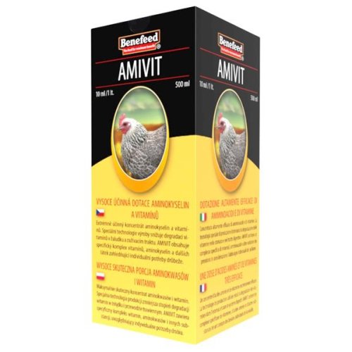 Vysoko účinná dotácia aminokyselín a vitamínov. AMIVIT sa používa najmä v situáciách ako je stresový stav, pri zdravotných problémoch a ich prevencii, pri nebezpečenstve infekcie, pri nedostatku vitamínov alebo aminokyselín v zime, nesprávnej výžive a pod. Prípravok podporuje rýchlu regeneráciu organizmu po ochoreniach, odporúča sa tiež podávať v období gravidity a mláďatám v čase rastu. Zloženie: vitamíny, aminokyseliny, prírodné látky, upravená pitná voda Podanie a dávkovanie: Podáva sa v množstve 10 ml na 1 liter napájacej vody po celý rok.