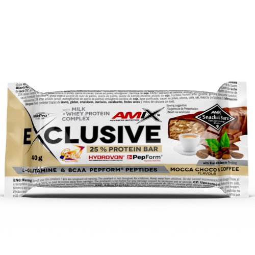 Exclusive bar je proteínová tyčinka s minimálnym obsahom bielkovín 25%. Dovoľujeme si vám predstaviť absolútnu novinku v oblasti proteínových tyčiniek na našom trhu. Exclusive Protein Bar ako jediná v SR obsahuje najkvalitnejšie patentované zdroje bielkovín - MilkPro® Protein Blend. Pri výrobe našich produktov starostlivo dbáme na použitie tých najkvalitnejších značkových surovín. Ani pri Exclusive Protein Bar tomu nie je inak. Ako zdroj bielkovín sme použili MilkPro® Protein Blend, ktorá obsahuje iba patentované suroviny CFM® srvátkový bielkovinový izolát a koncentrát, čiastočne hydrolyzovaný srvátkový izolát HydroVon®. Ďalej sme pridali hydrolyzované peptidy (L-glutamín PepForm®, BCAA PepForm®). Benefity: