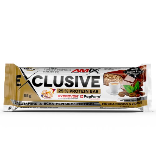 Exclusive bar je proteínová tyčinka s minimálnym obsahom bielkovín 25%. Dovoľujeme si vám predstaviť absolútnu novinku v oblasti proteínových tyčiniek na našom trhu. Exclusive Protein Bar ako jediná v SR obsahuje najkvalitnejšie patentované zdroje bielkovín - MilkPro® Protein Blend. Pri výrobe našich produktov starostlivo dbáme na použitie tých najkvalitnejších značkových surovín. Ani pri Exclusive Protein Bar tomu nie je inak. Ako zdroj bielkovín sme použili MilkPro® Protein Blend, ktorá obsahuje iba patentované suroviny CFM® srvátkový bielkovinový izolát a koncentrát, čiastočne hydrolyzovaný srvátkový izolát HydroVon®. Ďalej sme pridali hydrolyzované peptidy (L-glutamín PepForm®, BCAA PepForm®). Benefity: