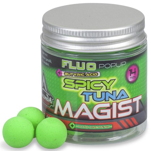 Vizuálne výrazné plávajúce nástrahy s atraktívnou príchuťou – úplne nové Anaconda Magist Fluo Pop Ups. Plávajúce nástrahy sú osladené neohesperidín dihydrochalkónom a uhladené kyselinou N'Bytricovou. Od ovocných cez sladké až po rybie – rozmanitosť príchutí tohto radu je až neuveriteľná. Použitie Fluo farieb spôsobuje, že táto nástraha je neskutočne dobre vidieť v čistej aj zakalenej vode. Vďaka ich širokej škále nájdete vždy tú správnu nástrahu, či už chytáte hlboko alebo na plytčine, v zakalenej alebo čistej vode, v rieke alebo na priehrade. Či už guľôčku nastražíte na chod náväzca, ako druhú guľôčku na panáčika alebo ako nástrahu pri love so zig náväzcom, môžete sa vždy spoľahnúť na jej skvelé vlastnosti.