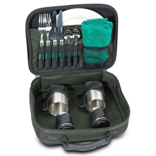 Ide o dvojdielnu jedálenskú sadu, kde má všetko svoje miesto. Sada obsahuje 2 hrnčeky, 2 taniere, 2 nože, 2 vidličky a 2 kávové lyžičky, všetko v nerezovom prevedení. Sada obsahuje uterák a 2 nádoby treba na soľ a korenie. Všetko je v pevnom, kvalitnom puzdre vyrobenom z vodeodolného polyesteru 600D. Prepravné rozmery sú 33 x 27 x 12 cm.