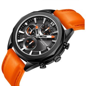 Pánske náramkové hodinky Napájanie z batérie Priemer puzdra 44,0 mm Puzdro v tvare kruhu Kovové puzdro Šedá farba puzdra Oranžová farba ťahu Ručičkový ciferník Šedá farba ciferníka Ciferník s dvanástimi indexmi Materiál skla - minerálne sklo Odolné proti vode