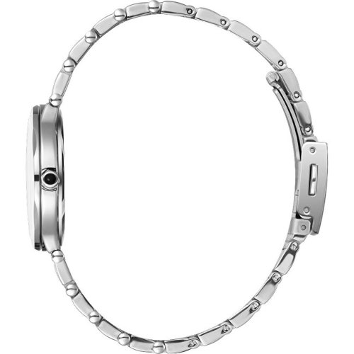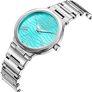 Dámske náramkové hodinky Napájanie z batérie Priemer puzdra 30,0 mm Puzdro v tvare kruhu Kovové puzdro Strieborná farba puzdra Kovový ťah Strieborná farba ťahu Ručičkový ciferník SVETLO MODRÁ farba ciferníku Ciferník s dvanástimi indexmi Materiál skla - minerál