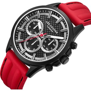 Pánske náramkové hodinky Napájanie z batérie Priemer puzdra 44,0 mm Puzdro v tvare kruhu Kovové puzdro ČIERNA farba puzdra Červená farba ťahu Ručičkový ciferník Čierna farba ciferníka Ciferník s dvanástimi indexmi Materiál skla - minerálne sklo Odolné proti vode pri bežnom