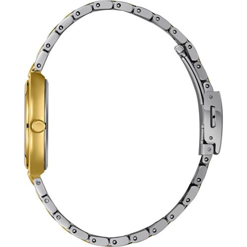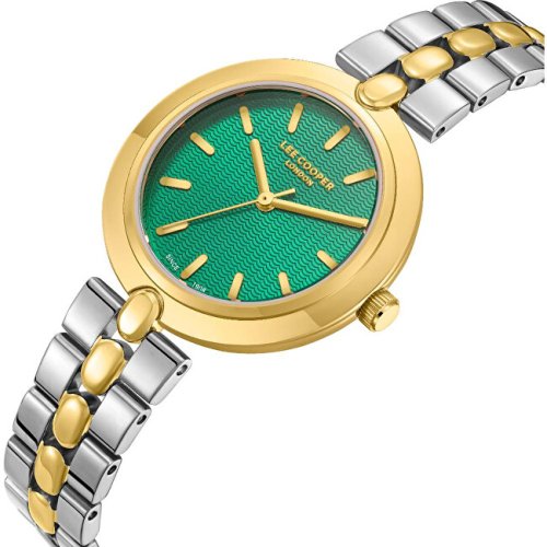 Dámske náramkové hodinky Napájanie z batérie Priemer puzdra 32,0 mm Puzdro v tvare kruhu Kovové puzdro Strieborná/zlatá farba puzdra Kovový ťah Strieborná/zlatá farba ťahu Ručičkový ciferník Zelená farba ciferníku Ciferník s dvanástimi indexmi Materiál