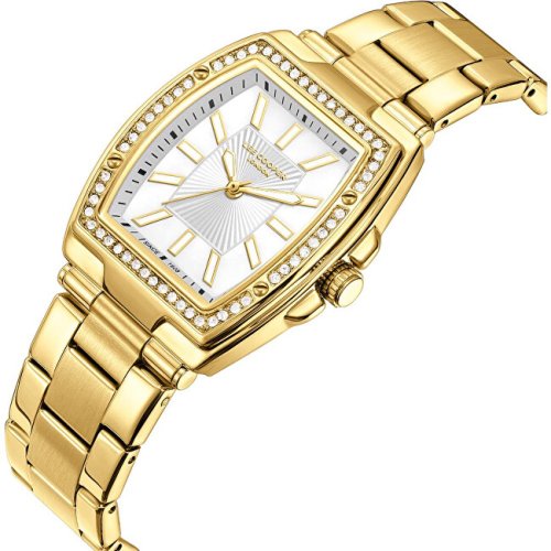 Dámske náramkové hodinky Napájanie z batérie Priemer puzdra 30,0 mm Puzdro v tvare obdĺžnika Kovové puzdro Zlatistá farba puzdra Kovový ťah Zlatistá farba ťahu Ručičkový ciferník Strieborná farba ciferníka Ciferník s dvanástimi indexmi Materiál skla - minerálne sklo