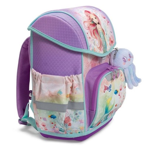 Anatomická školská aktovka MERMAID - morská panna vyznačujúca sa týmito top vlastnosťami: <br> • 3D ergonomický dizajn chrbtového dielu aktovky pre správne rozloženie hmotnosti s vysoko kvalitnou sieťovinou s mäkkým polstrovaním <br> • pevný tvar vystužený po celej výške, šírke a hĺbke aktovky so zapínaním <br> • nastaviteľné, ergonomicky tvarované ramenné popruhy a regulovateľný hrudný popruh s praktickým magnetickým zapínaním <br> • hlavný priestor s ďalšou úložnou priehradkou spevnený s gumou po bokoch na prispôsobenie sa obsahu, vhodný do formátu A4 <br> • spevnené plastové dno s nôžkami reflexné bezpečnostné prvky vpredu, vzadu a na bokoch <br> • rozšíriteľné bočné vrecká s pevnou gumičkou po celej šírke vrecka <br> • predné vrecko na desiatu alebo na peračník s izolačnou fóliou zvnútra vonkajšie vrecká, obojstranné zapínanie na zips - na zips prívesok morská hviezda fialovo-modrá chobotnica s krúžkom na kľúče a karabínou <br> • rozvrh hodín a menovka vo vnútri tašky <br> • hmotnosť len 1.250 g <br> • objem 25 litrov