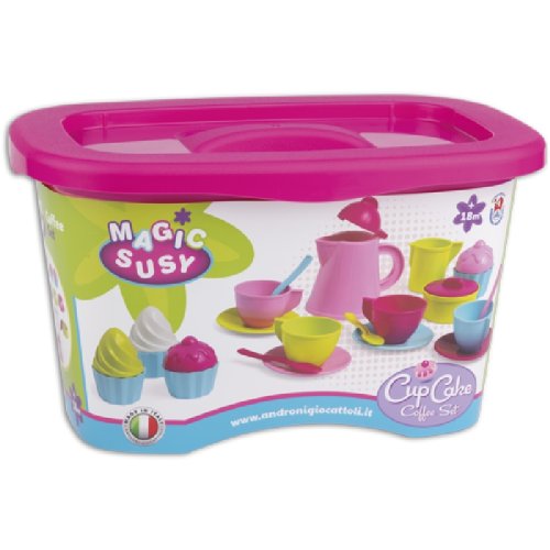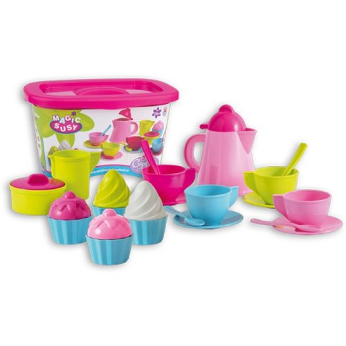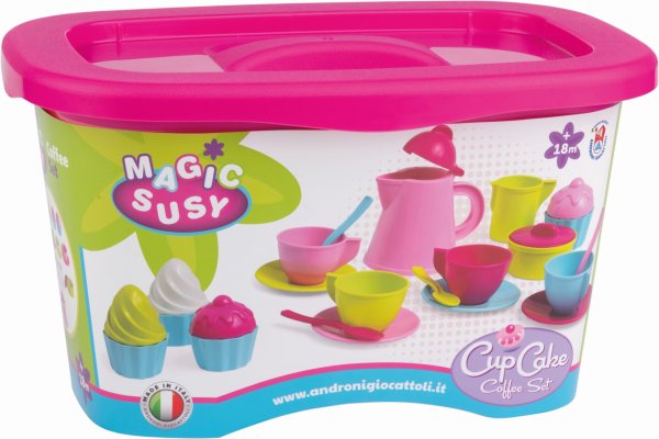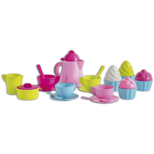 24dielna sada kuchynského riadu, vyrobená z kvalitných plastov v Taliansku. Obsahuje: Kanvicu, 4 hrnčeky s podšálkami na kávu alebo čaj, 4 kávové lyžičky, cukorničku s viečkom, kanvičku na mlieko, 4 x cupcake a úložný box s vekom. Rozmery boxu: 28,5 x 19 x 16,5 cm (dx š xv), váha 0,93 kg. Odporúčaný vek od 18 mesiacov.