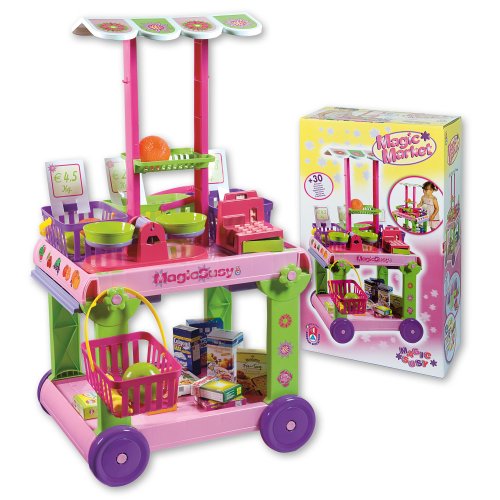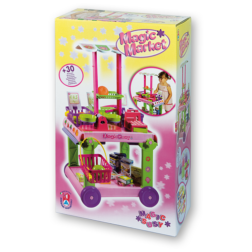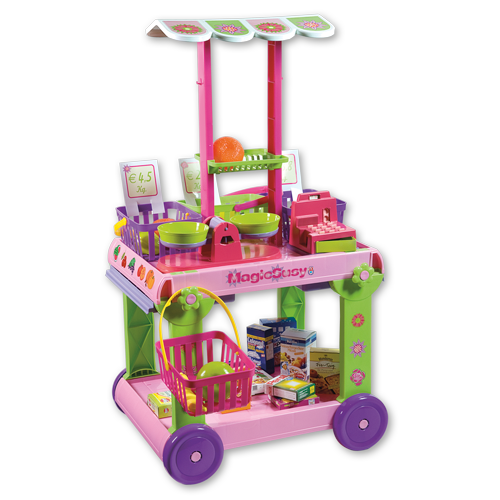 Pojazdná tržnica s bočným výsuvným pultom, vyrobená z kvalitných plastov v Taliansku. Obsahuje: pojazdný vozík s odnímateľnou strieškou, 4 košíky s rukoväťou, pokladňu s mincami, váhu s miskami, 12 kusov ovocia a zeleniny a 8 škatuliek s potravinovým alebo drogistickým tovarom. Rozmery tržnice so strieškou: 37 x 18 x 85 cm (dx š xv), rozmery tržnice bez striešky: 37 x 18 x 60 cm (dx š xv), váha 3,57 kg. Odporúčaný vek od 36 mesiacov. Výrobca, talianska firma Androni Giocattoli sídliaca neďaleko Milána, sa špecializuje na výrobu plastových hračiek na piesok a záhradu a tiež stavebníc UNICO Plus už od roku 1974. Jej mottom je heslo: Androni Toys: Kvalita vyrobená v Taliansku. Používané plasty sú pevné, ale zároveň pružné a pri bežnom hraní nedochádza k ich praskaniu. Vydržia aj väčšiu záťaž a preto sú výrobky vhodné aj do škôlok, kde takmer denne prechádzajú zaťažkávacou skúškou.