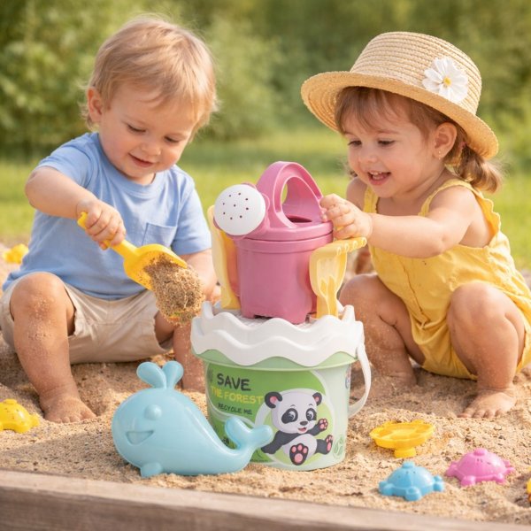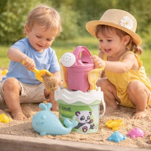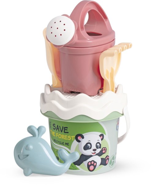 6dielna sada na piesok, vyrobená z kvalitných recyklovaných plastov v pastelových farbách v Taliansku. Obsahuje: vedierko, kanvičku 0,5 l, sitko, lopatku, hrabličky a tvorítko v tvare morského živočícha. Vedierko: priemer 13 cm, výška 11 cm. Súprava: výška 27,5 cm, váha 0,244 kg. Odporúčaný vek od 10 mesiacov.