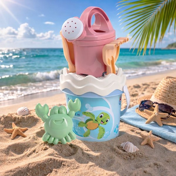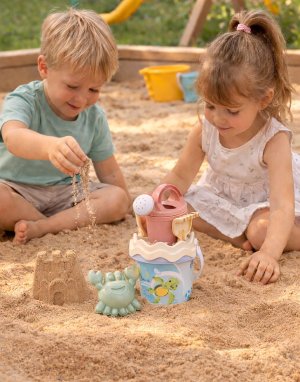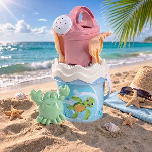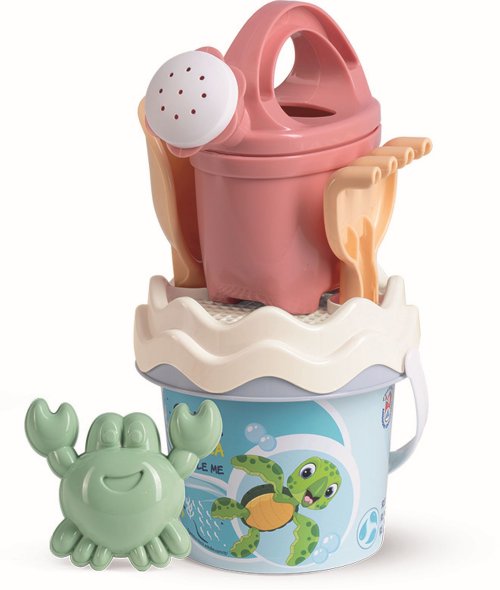 6dielna sada na piesok, vyrobená z kvalitných recyklovaných plastov v pastelových farbách v Taliansku. Obsahuje: vedierko, kanvičku 0,5 l, sitko, lopatku, hrabličky a tvorítko v tvare morského živočícha. Vedierko: priemer 13 cm, výška 11 cm. Súprava: výška 27,5 cm, váha 0,244 kg. Odporúčaný vek od 10 mesiacov.