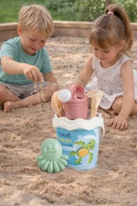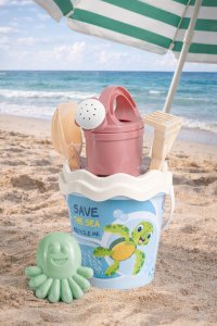 6dielna sada na piesok, vyrobená z kvalitných recyklovaných plastov v pastelových farbách v Taliansku. Obsahuje: vedierko, kanvičku 0,5 l, sitko, lopatku, hrabličky a tvorítko v tvare chobotnice. Vedierko: priemer 17 cm, výška 16 cm. Súprava: výška 32 cm, váha 0,314 kg. Odporúčaný vek od 10 mesiacov.
