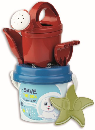 6dielna sada na piesok, vyrobená z kvalitných recyklovaných plastov v Taliansku. Obsahuje: vedierko, kanvičku 0,5 l, sitko, lopatku, hrabličky a tvorítko v tvare morskej hviezdice. Vedierko: priemer 13 cm, výška 11 cm. Súprava: výška 29 cm, váha 0,35 kg. Odporúčaný vek od 12 mesiacov.