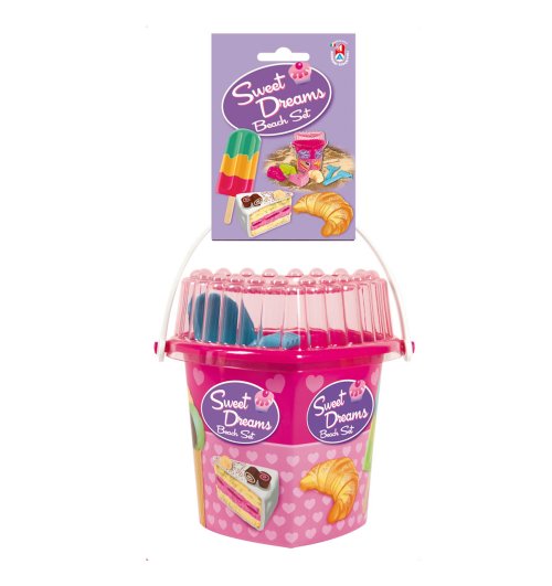 8dielna sada na piesok, vyrobená z kvalitných plastov v Taliansku. Obsahuje: vedierko v tvare srdca s vekom, lopatku a hrabličky, 4 formičky s tematickými tvarmi - točená zmrzlina, nanuk, mriežkový koláč a croissant. Vedierko: priemer 19 cm, výška 16 cm. Súprava: výška 21 cm, váha 0,4 kg. Odporúčaný vek od 12 mesiacov.