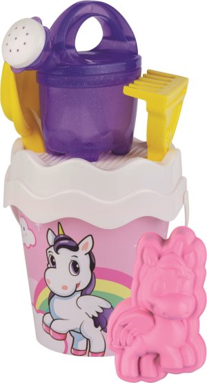 Súprava obsahuje: kýblik s motívom jednorožca (výška 11 cm), lopatku, hrable, kanvičku, sitko a formičku s motívom plameniaka.