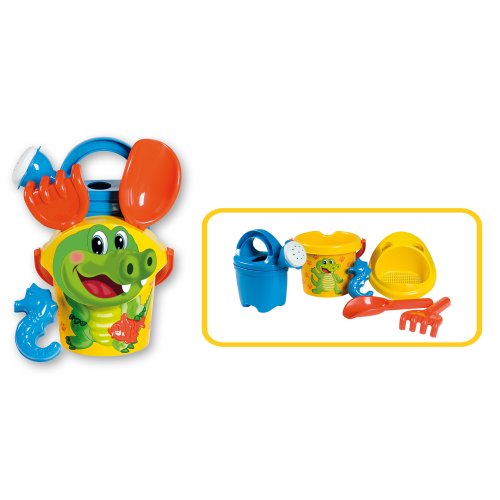 6dielna sada na piesok, vyrobená z kvalitných plastov v Taliansku. Obsahuje: vedierko priemer 13 cm, výška 11 cm, kanvičku 0,5 l, sitko, lopatku, hrabličky a tvorítko v tvare morského koníka. Súprava: výška 23 cm, váha 0,36 kg. Odporúčaný vek od 12 mesiacov.