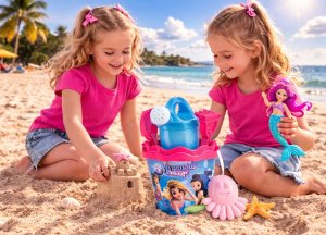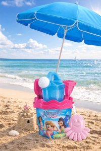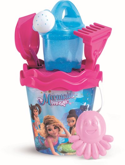 6dielna sada na piesok, vyrobená z kvalitných recyklovaných plastov v Taliansku. Obsahuje: vedierko, kanvičku s trblietkami 0,5 l, sitko, lopatku, hrabličky a tvorítko v tvare chobotnice. Vedierko: priemer 17 cm, výška 16 cm. Súprava: výška 32 cm, váha 0,314 kg. Odporúčaný vek od 10 mesiacov.