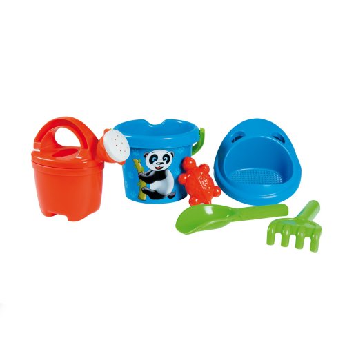 6dielna sada na piesok, vyrobená z kvalitných plastov v Taliansku. Obsahuje: vedierko priemer 13 cm, výška 11 cm, kanvičku 0,5 l, sitko, lopatku, hrabličky a tvorítko v tvare korytnačky. Súprava: výška 23 cm, váha 0,36 kg. Odporúčaný vek od 10 mesiacov.