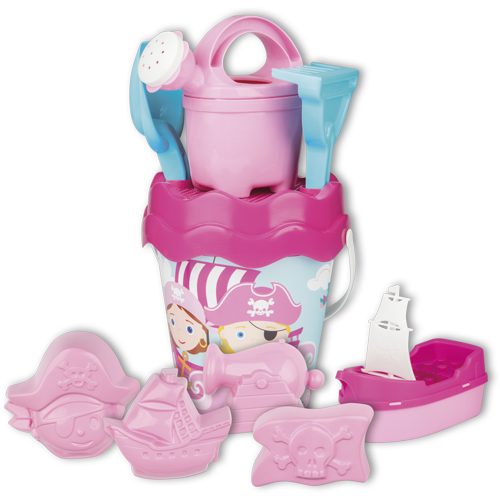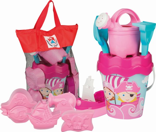 10dielna sada na piesok, vyrobená z kvalitných plastov v Taliansku. Obsahuje: vedierko s priemerom 17 cm, sitko, kanvičku 0,5 l, lopatku a hrabličky, pirátsku loďku a 4 formičky s pirátskou tematikou. Všetko je uložené v praktickej cestovnej sieťovanej taške. Rozmery balenia: 28 x 11 x 34 cm (dx š xv). Váha sady: 0,64 kg. Odporúčaný vek od 12 mesiacov. Výrobca, talianska firma Androni Giocattoli sídliaca neďaleko Milána, sa špecializuje na výrobu plastových hračiek na piesok a záhradu a tiež stavebníc UNICO Plus už od roku 1974. Jej mottom je heslo: Androni Toys: Kvalita vyrobená v Taliansku. Používané plasty sú pevné, ale zároveň pružné a pri bežnom hraní nedochádza k ich praskaniu. Vydržia aj väčšiu záťaž a preto sú výrobky vhodné aj do škôlok, kde takmer denne prechádzajú zaťažkávacou skúškou.