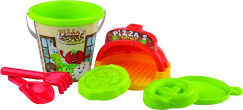 7dielna sada na piesok, vyrobená z kvalitných plastov v Taliansku. Obsahuje: vedierko, sito v tvare pizza pece, lopatku a hrabličky, tvorítko v tvare formy na pečenie a tvorítko na pizzu a pletenec. Vedierko: priemer 17 cm, výška 16 cm. Súprava: výška 27 cm, váha 0,24 kg. Odporúčaný vek od 12 mesiacov.